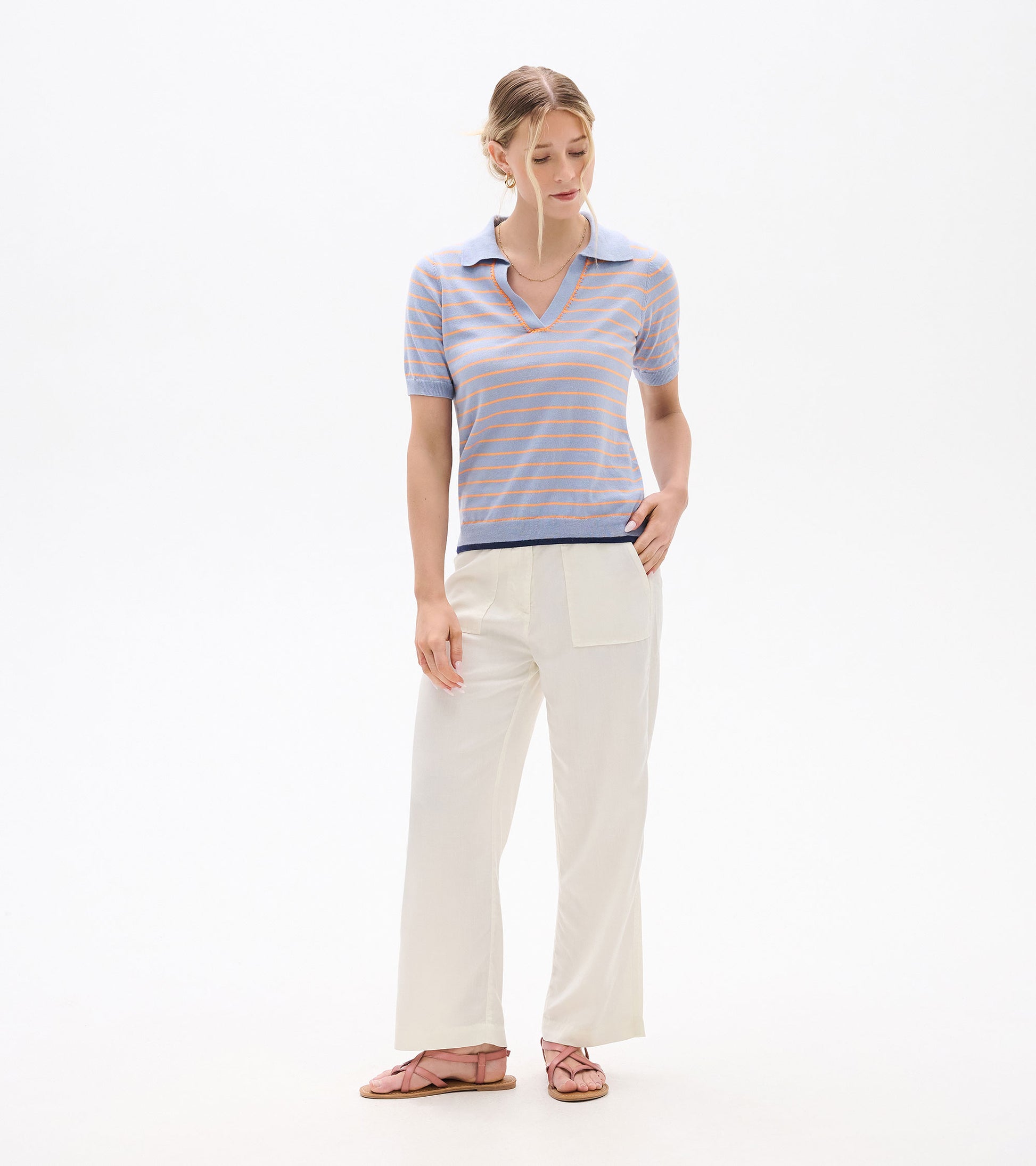This charming casual top brings retro-inspired style to your everyday wardrobe with its distinctive Johnny collar and thoughtful details. The soft cotton jersey feels like your favorite vintage tee but looks infinitely more polished, making it perfect for casual Fridays, weekend errands, or relaxed get-togethers. The blanket stitch detail at the neckline adds artisanal charm, while ribbed cuffs and hem provide a finished look. Side slits ensure comfortable movement and add a modern touch to the classic silhouette. The serene stripe pattern in calming colors pairs beautifully with everything from white denim to khaki shorts for effortless warm-weather style.