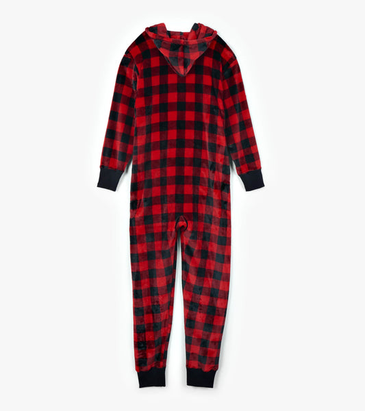 Adult Buffalo Plaid Hooded Fleece Jumpsuit