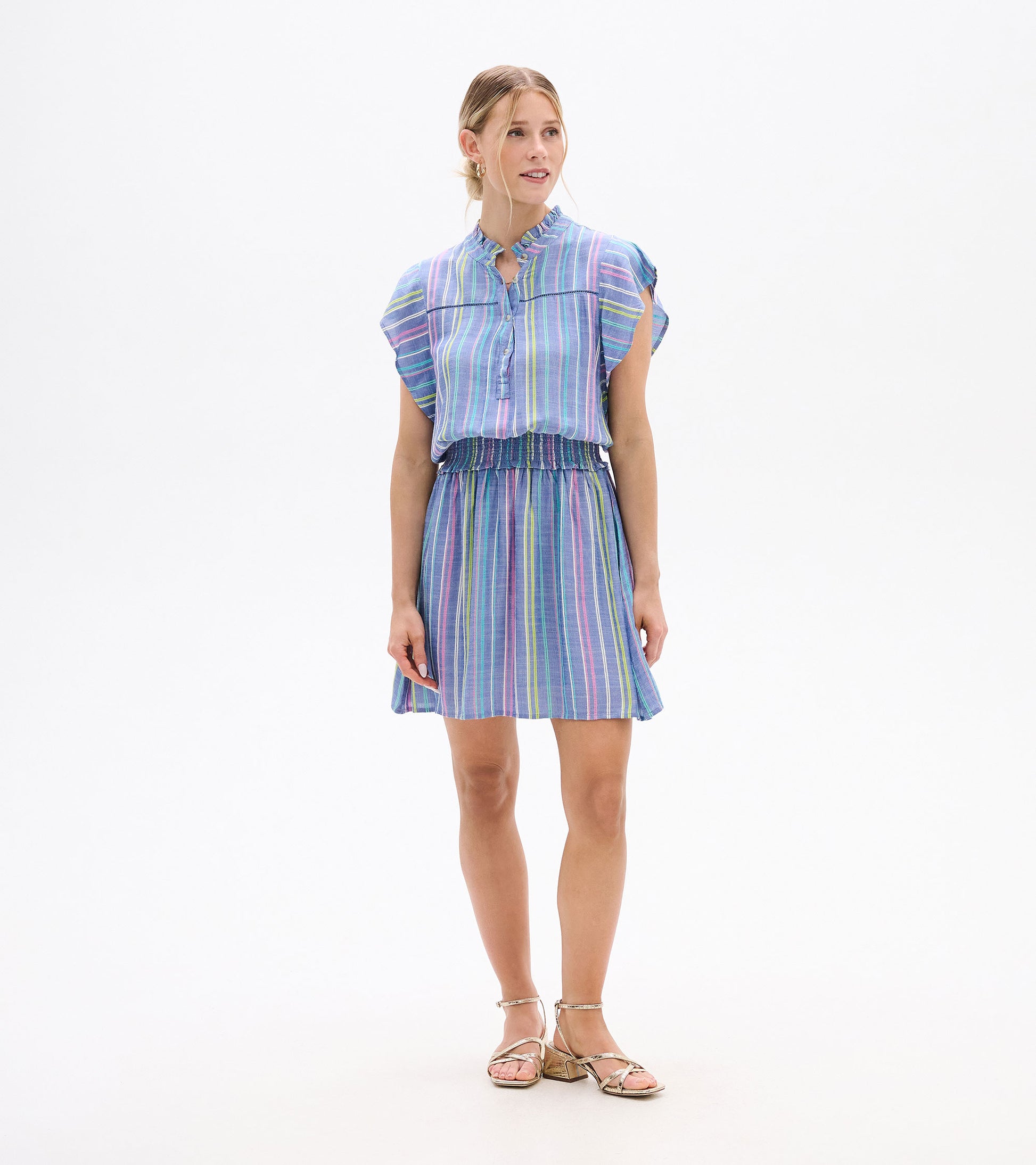 Turn heads at garden parties and summer celebrations in this beautifully feminine midi dress. The button-front design with stand collar and ruffle detail creates an elegant neckline, while the smocked waist provides comfortable definition that flatters every figure. Flutter sleeves add a playful, romantic touch that's perfect for warm-weather events, and the breathable modal blend keeps you cool and comfortable all day long. The lined skirt ensures confident wear, making this your go-to dress for everything from outdoor weddings to bridal showers to special date nights.