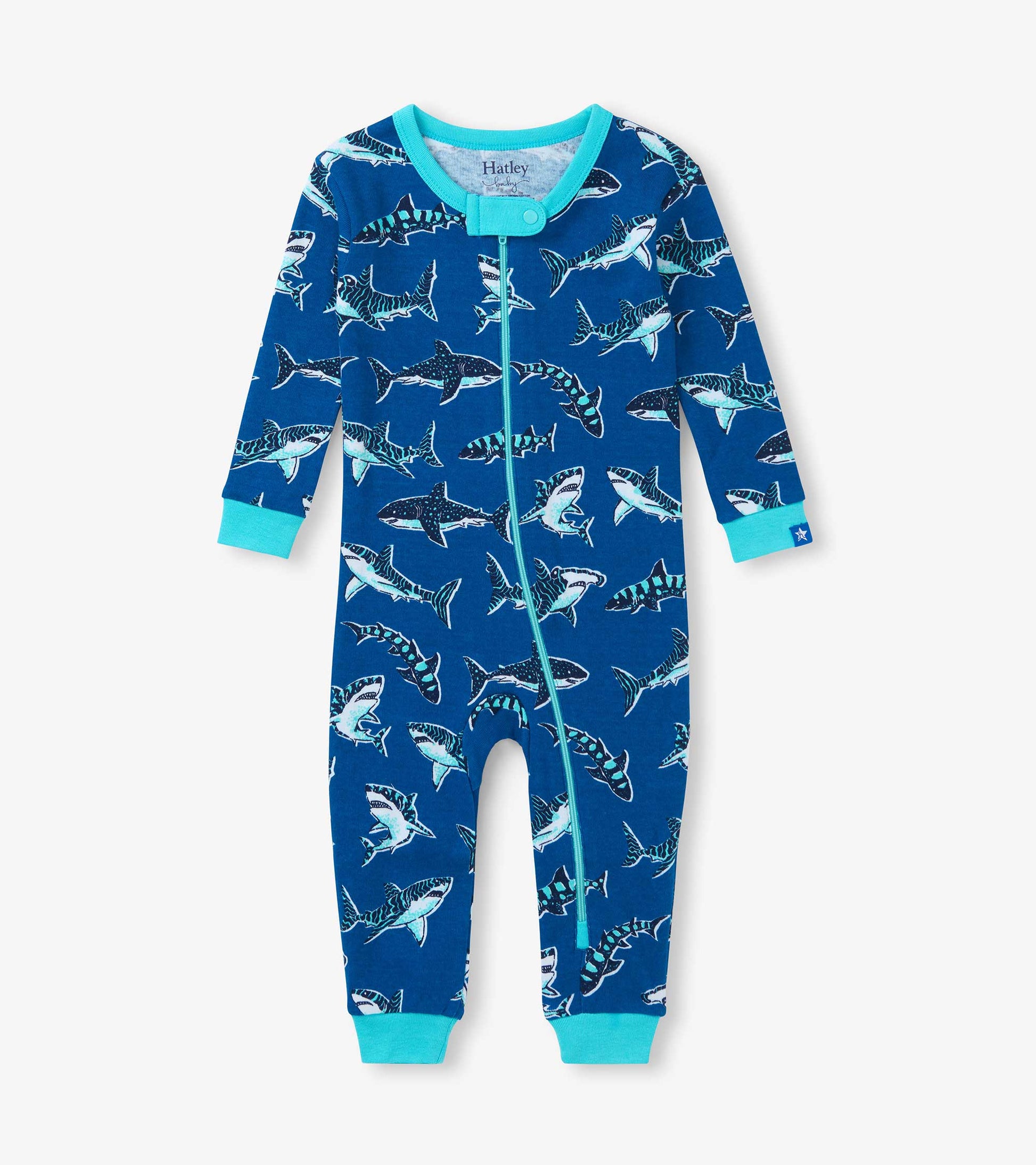 Friendly patterned sharks swim across this cozy sleeper that little ocean fans will adore. Crafted from organically grown cotton that's gentle on sensitive skin and soft to the touch. The convenient full-length zipper with protective chin guard makes nighttime changes fast and fuss-free. Snug-fit design with cozy cuffs meets all sleepwear safety requirements for worry-free rest. Footless styling keeps things cool and provides room for those rapidly growing baby feet.