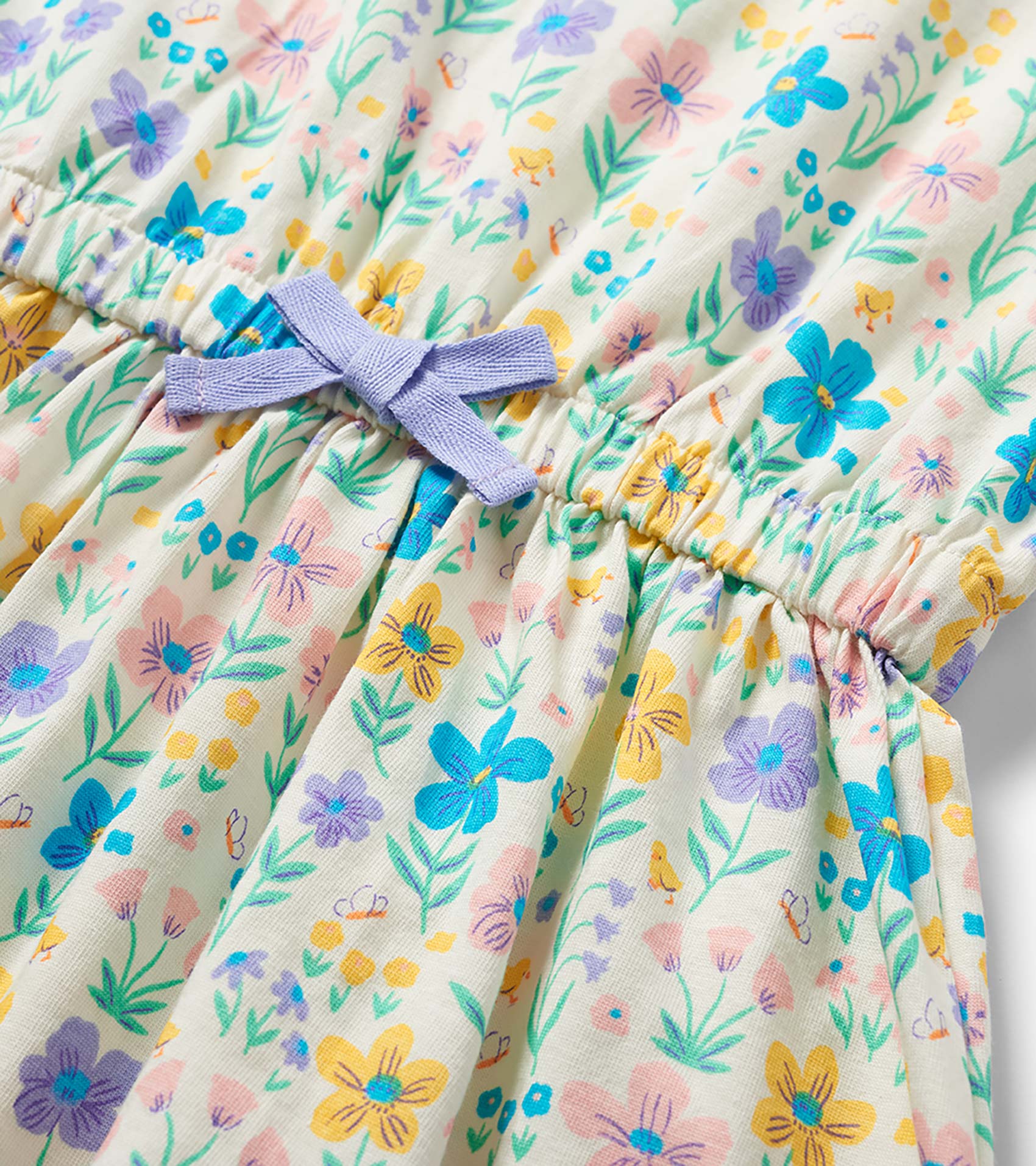 This charming short-sleeve dress features a light cream background scattered with a charming all-over print of wildflowers in soft shades of blue, yellow, lavender, and pink. A lavender pre-tied bow at the waist adds a lovely pop of colour, while the elastic waistband and gentle shoulder snaps make dressing easy and comfortable. It’s the perfect pick for her sunshine-filled days and picture-perfect moments.