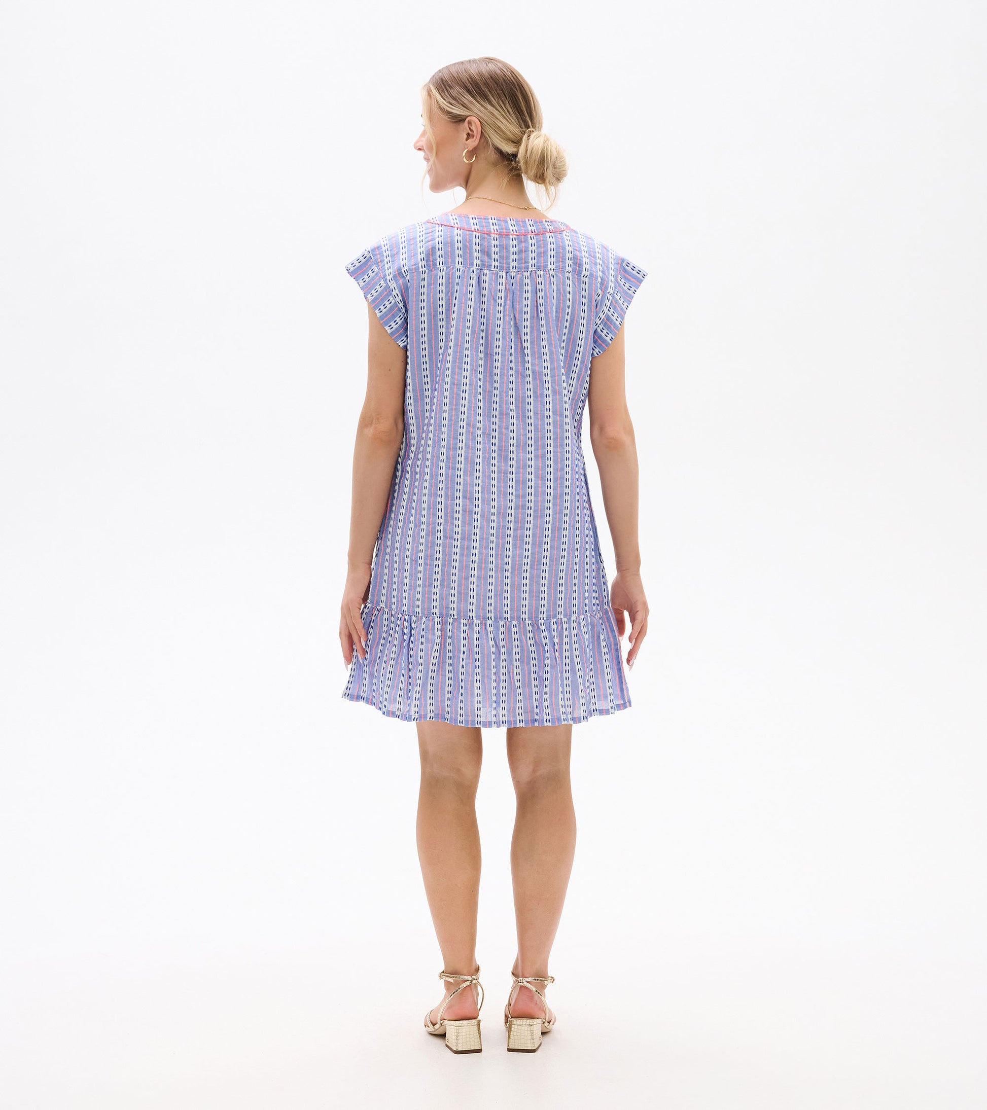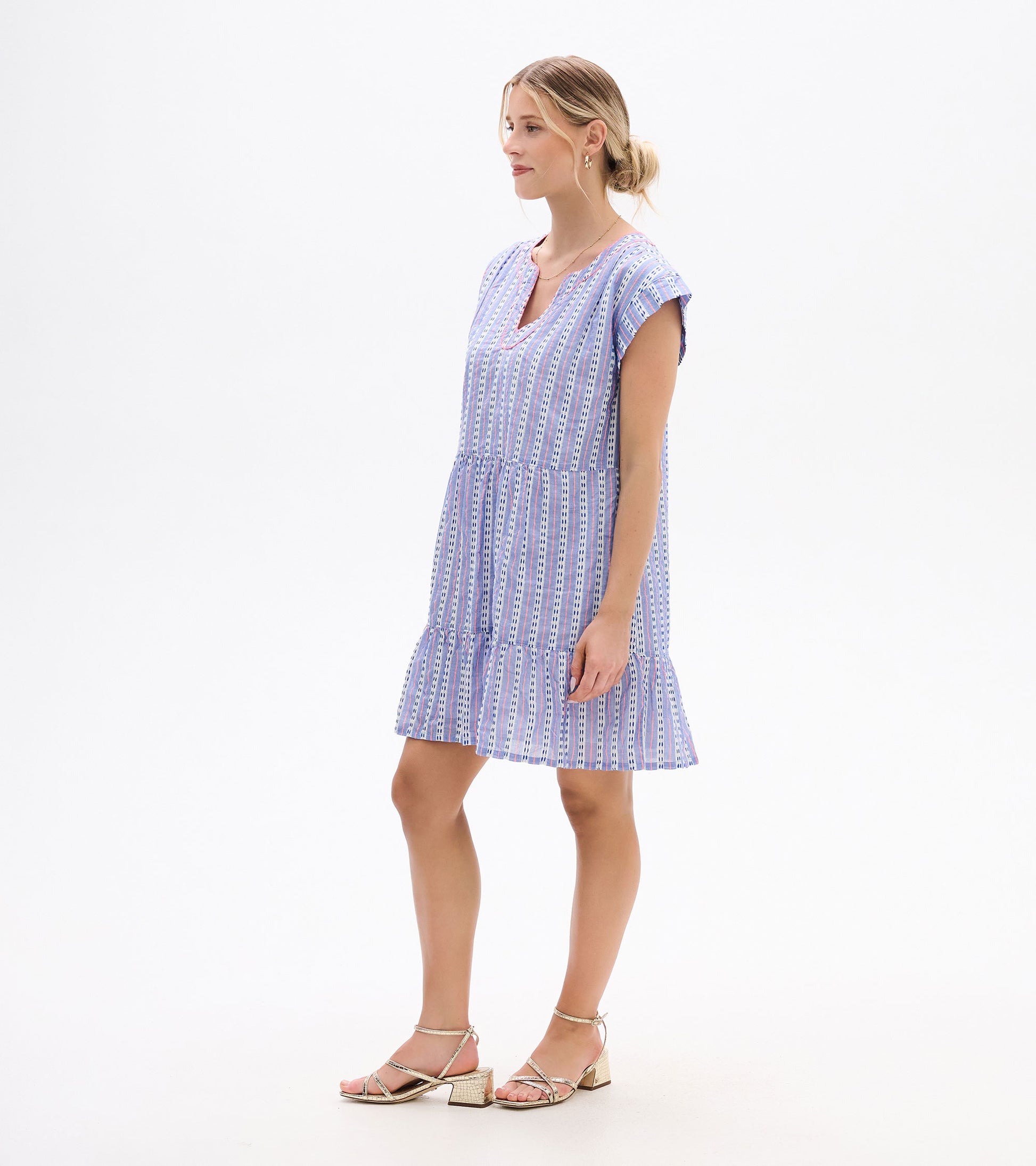 Light and airy, this summer dress features a softly textured weave and a breezy tiered skirt that moves with ease. The soft V-neckline is accented with subtle decorative contrast stitching, while cap sleeves add a relaxed finish. Vertical stripes in shades of light blue, white, and navy are accented with thin coral lines, bringing a fresh touch of colour to the breezy silhouette. A go-to piece for effortless, everyday wear.