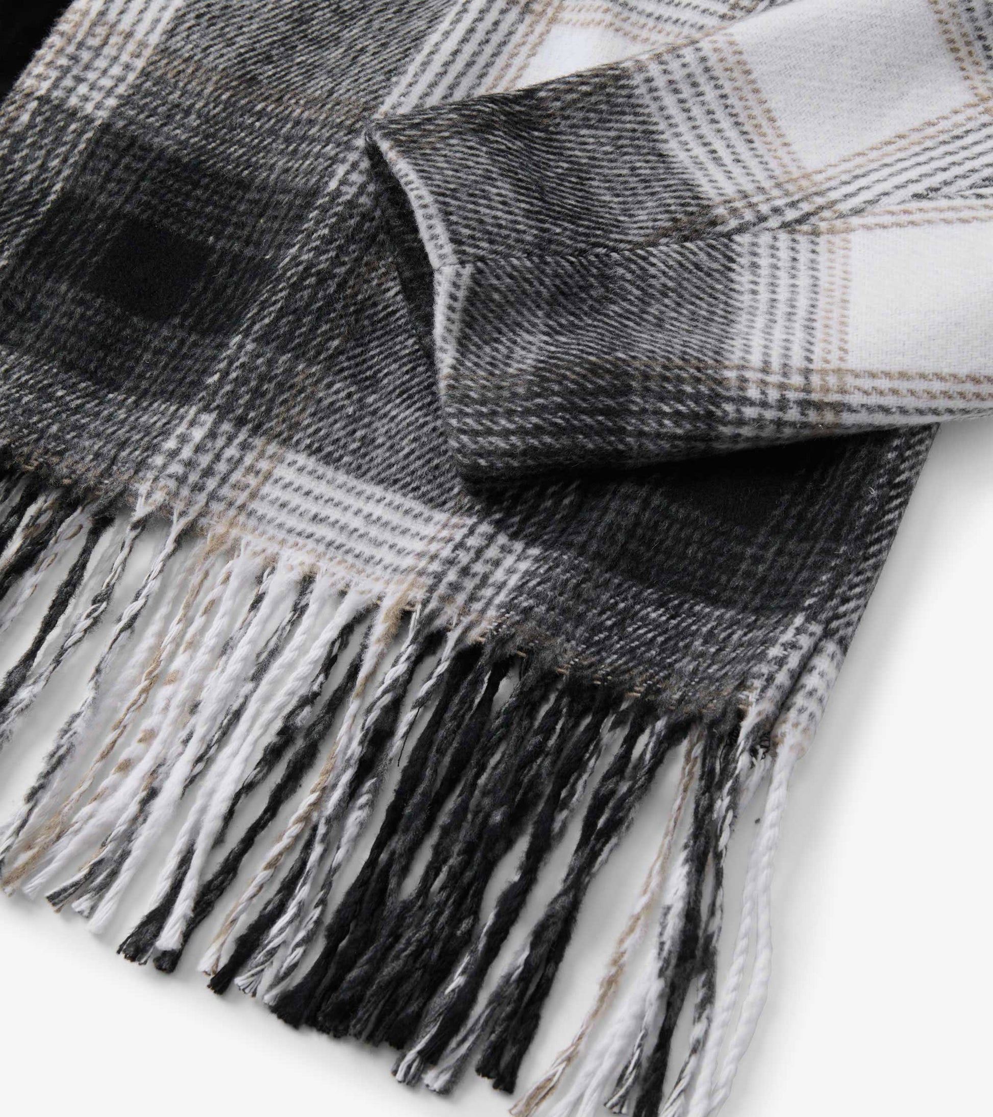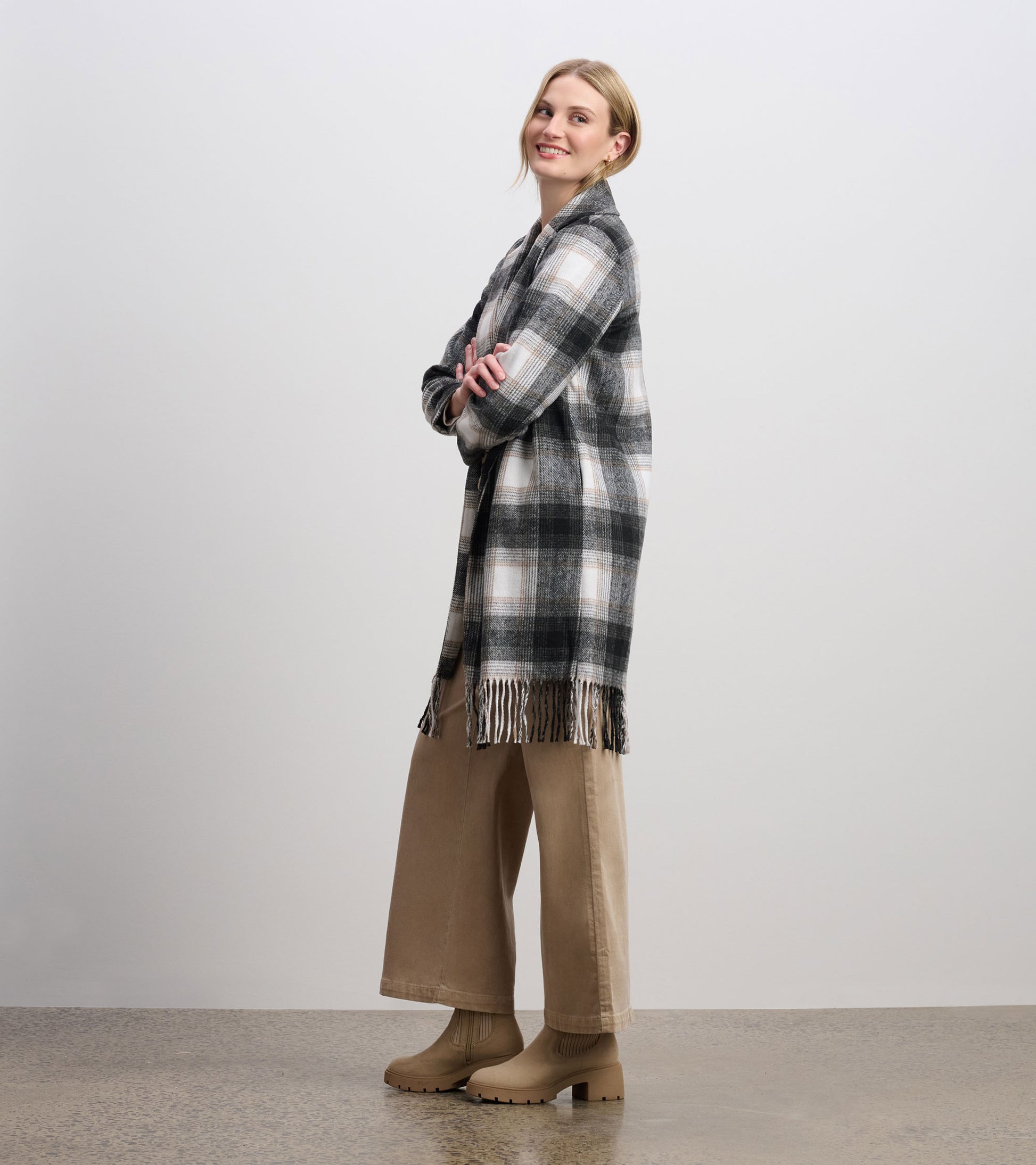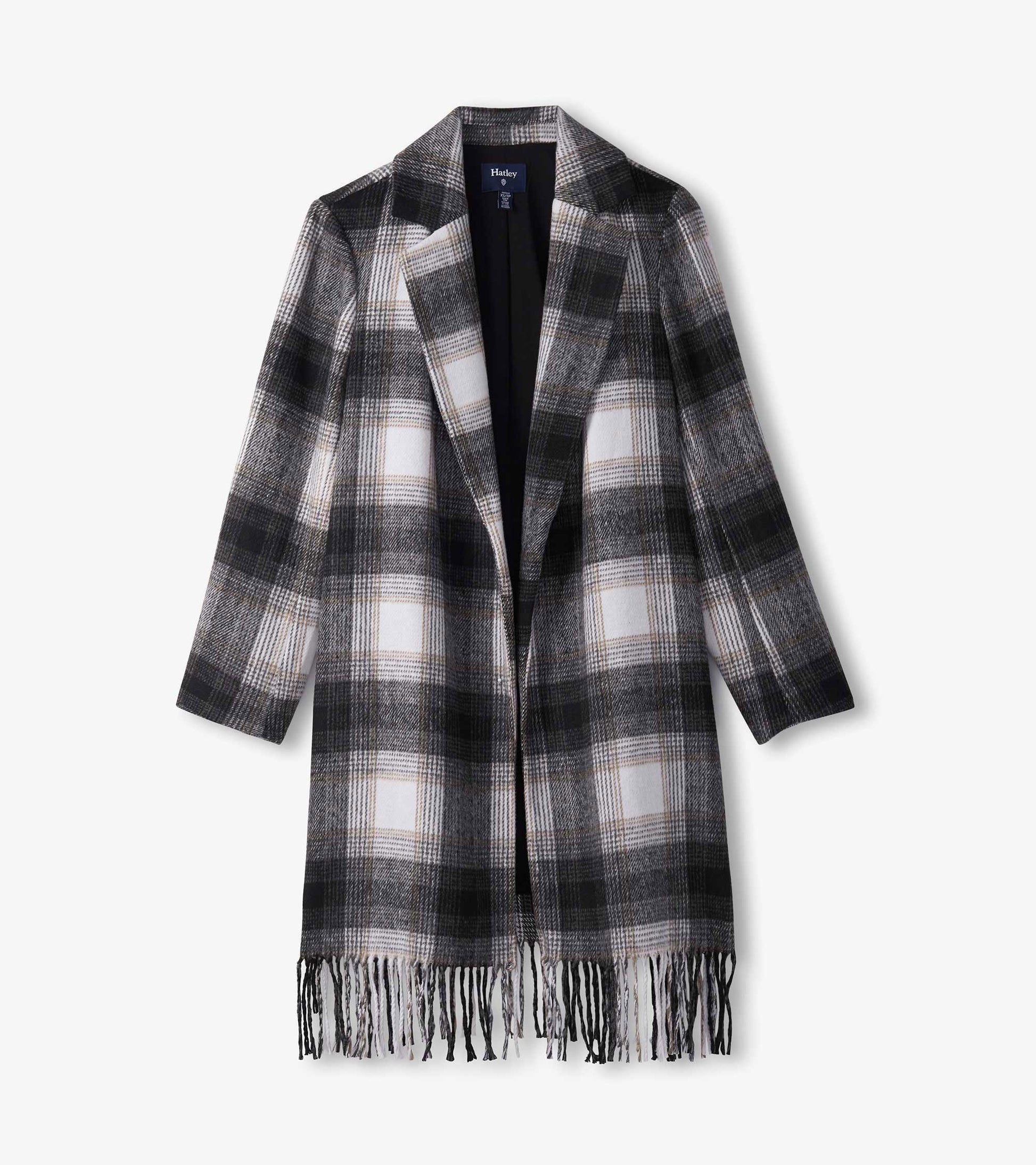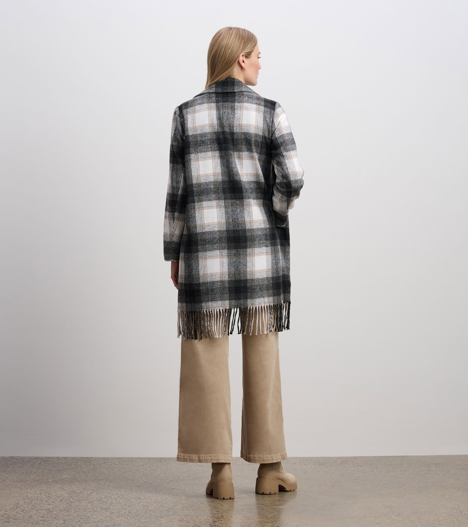 The Fringe Jacket in Black and Taupe Plaid is a polished outerwear piece with a stylish twist. Its notched collar, smooth lining, and fringed hem create a refined yet contemporary look. Perfect for layering over dresses or pairing with denim, it balances structure with comfort. A versatile women’s jacket designed for chic transitions between work and weekends.