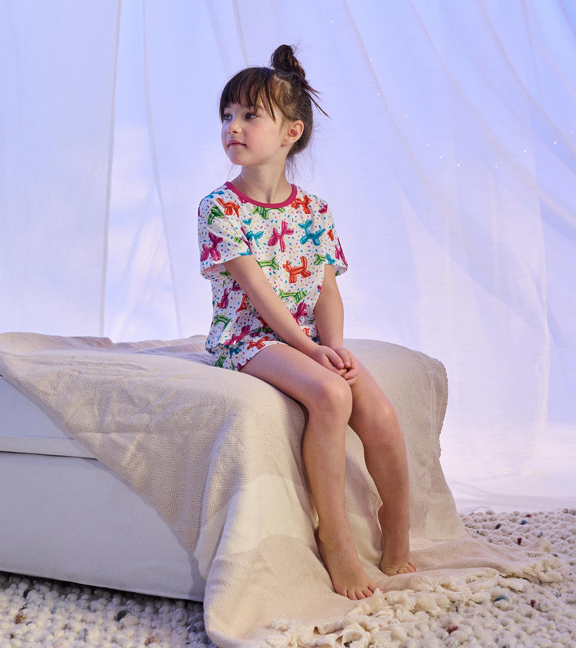 Whimsical balloon animals bring playtime fun to this comfortable short sleep set. Soft polyester fabric keeps her cool during warm summer nights while feeling gentle against skin. The ribbed crew neckline maintains its shape while comfortable short sleeves provide breathability. Easy pull-on pants with a stretchy waist make nighttime dressing simple and quick. A playful choice for girls who love animals and comfortable sleep equally.