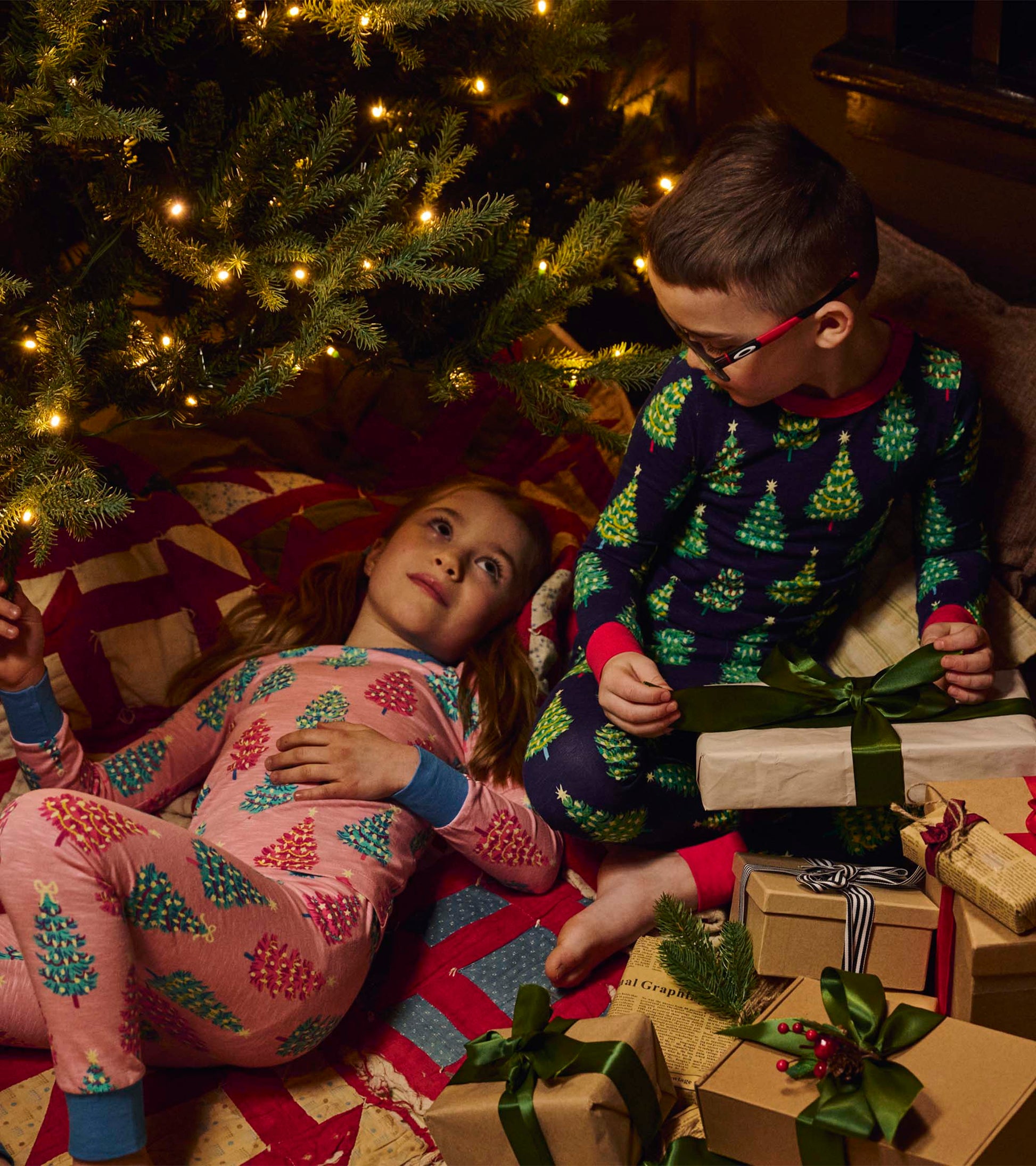 Add festive cheer to her bedtime with the Girls Pink Bottle Brush Trees Cotton Pajama Set, crafted from stretch slub jersey made with organically grown cotton for a soft, eco-friendly touch. This cozy set includes a long-sleeve top with a crew neckline and matching pants with an elastic waistband for a comfy, secure fit. The light heathered pink background is sprinkled with a joyful all-over print of Christmas trees in bright colours like blue, teal, red, and pink, each adorned with ornaments and topped with stars. Bright blue accents on the collar, sleeve cuffs, and pant cuffs add a playful, contrasting finish.