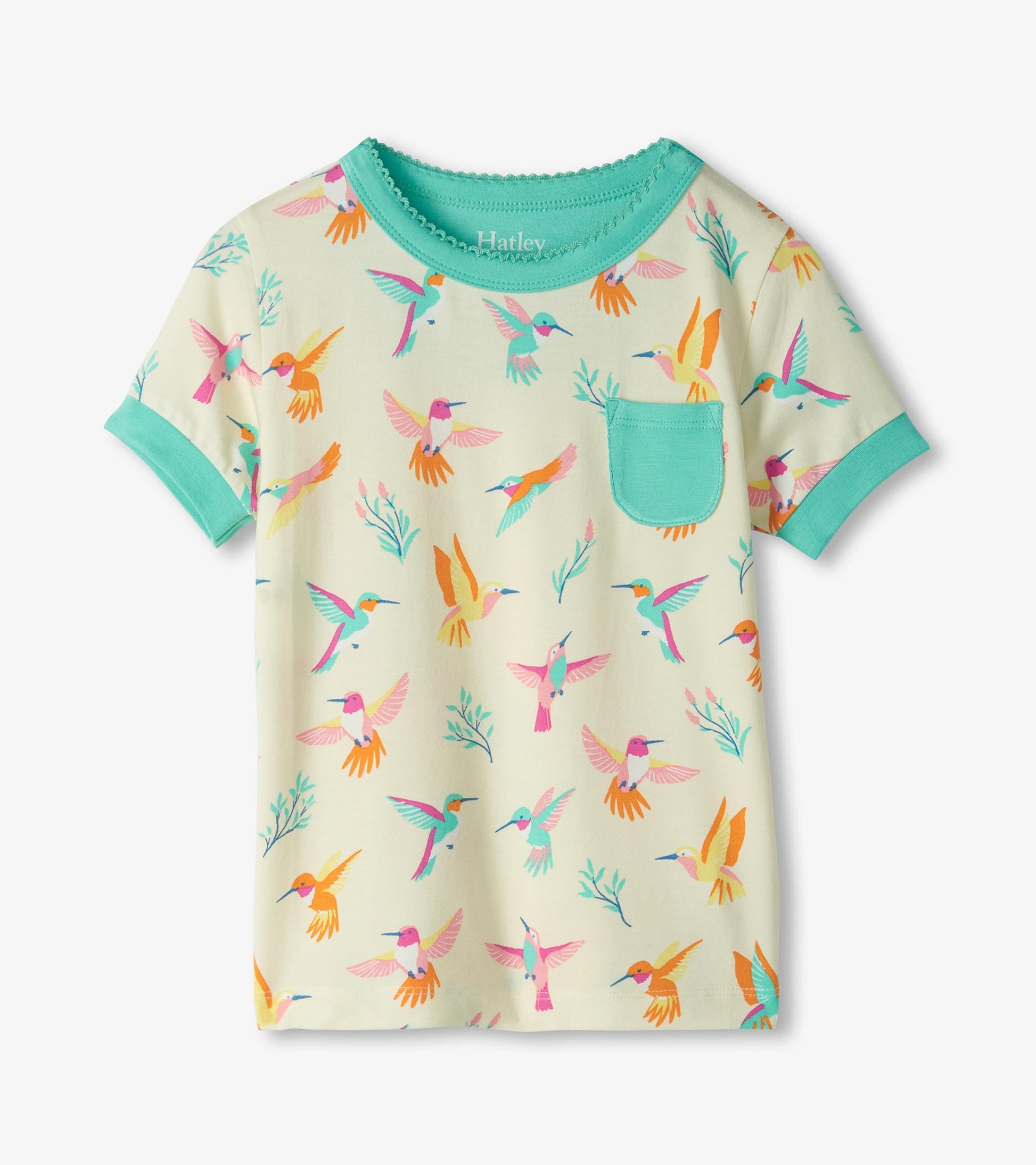 Drift into dreamland with these cozy PJs! Made from a silky-soft bamboo and elastane blend, this breathable short-sleeve set is perfect for gentle mornings. The cream background is brought to life with an all-over pastel print of delicate hummingbirds and foliage, while aqua ribbed trim at the crew neckline, armholes, waist, and leg openings adds playful contrast. Light, comfy, and beautifully detailed, these pajamas are a bedtime favourite in the making.