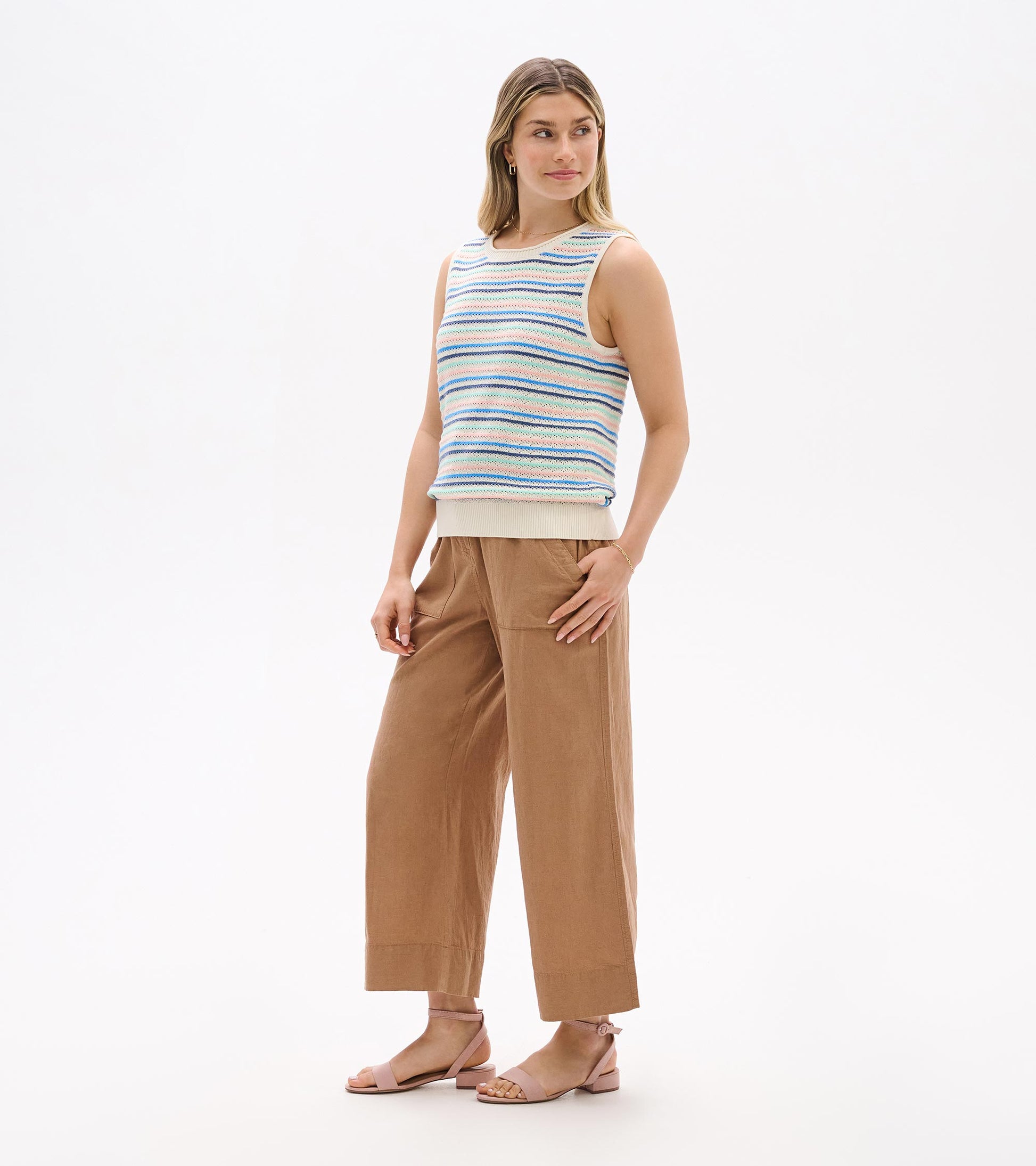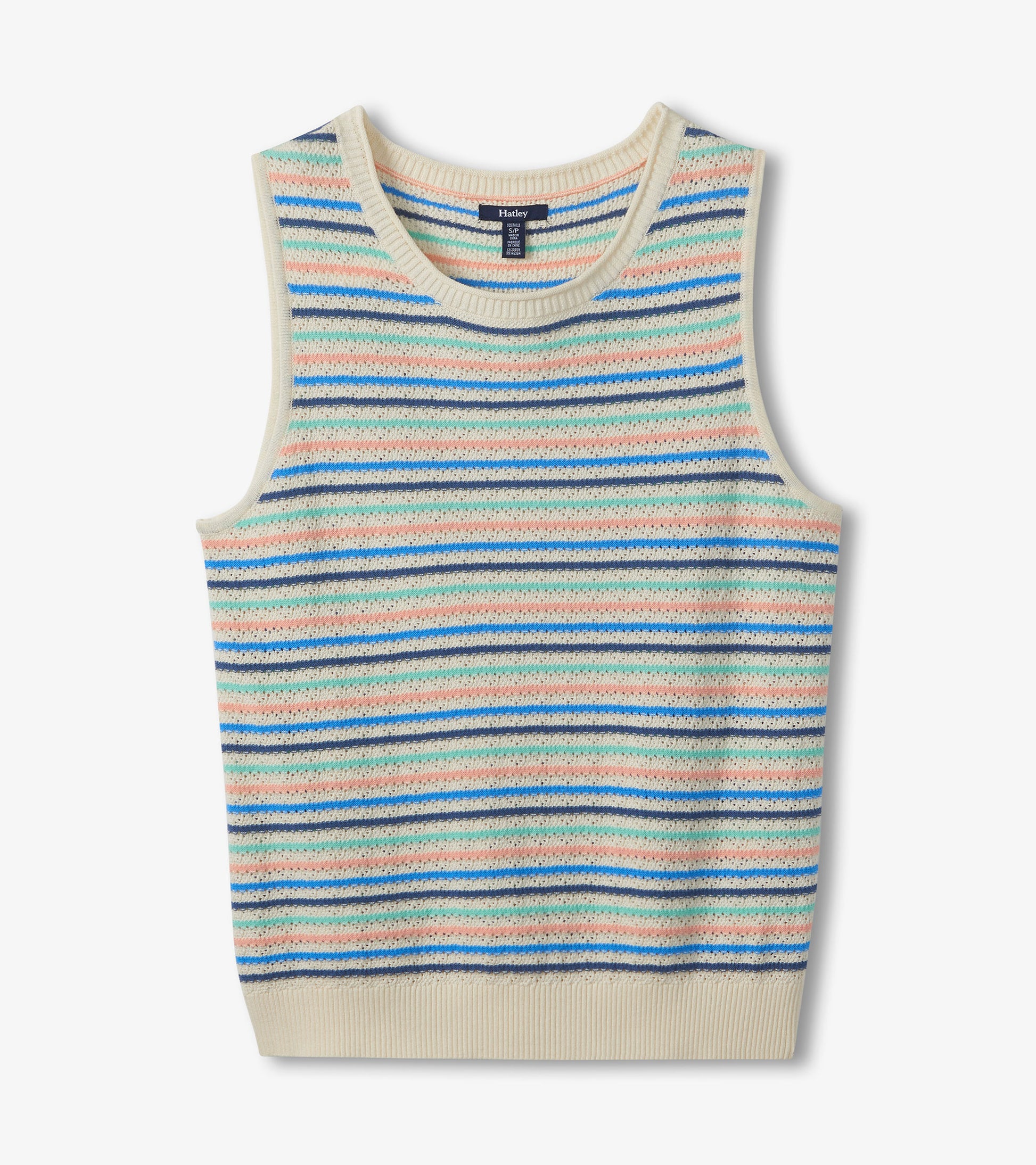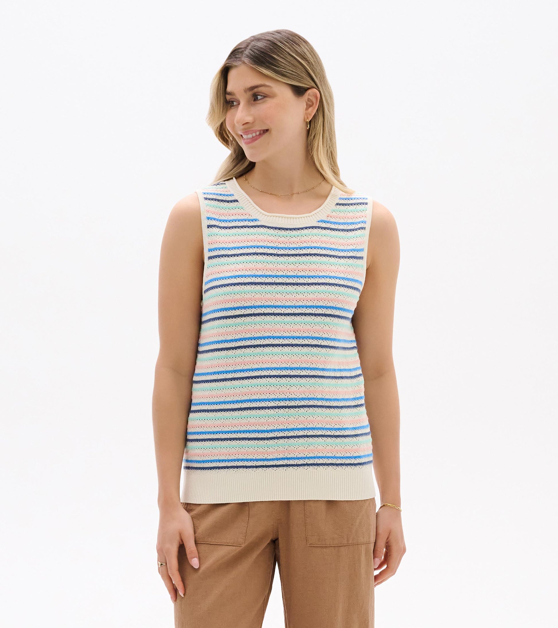 Light and breathable, this sleeveless knit tank is crafted from soft cotton with a textured feel and decorative openwork details for added dimension. Horizontal stripes in soft hues of cream, blue, aqua, and blush sit over a neutral base, creating a gentle, airy palette. Designed with a classic crew neck and ribbed trim at the neck, armholes, and hem, it’s perfect on its own or layered over long sleeves on cooler transitional days. An easy-to-layer piece made for relaxed versatility.