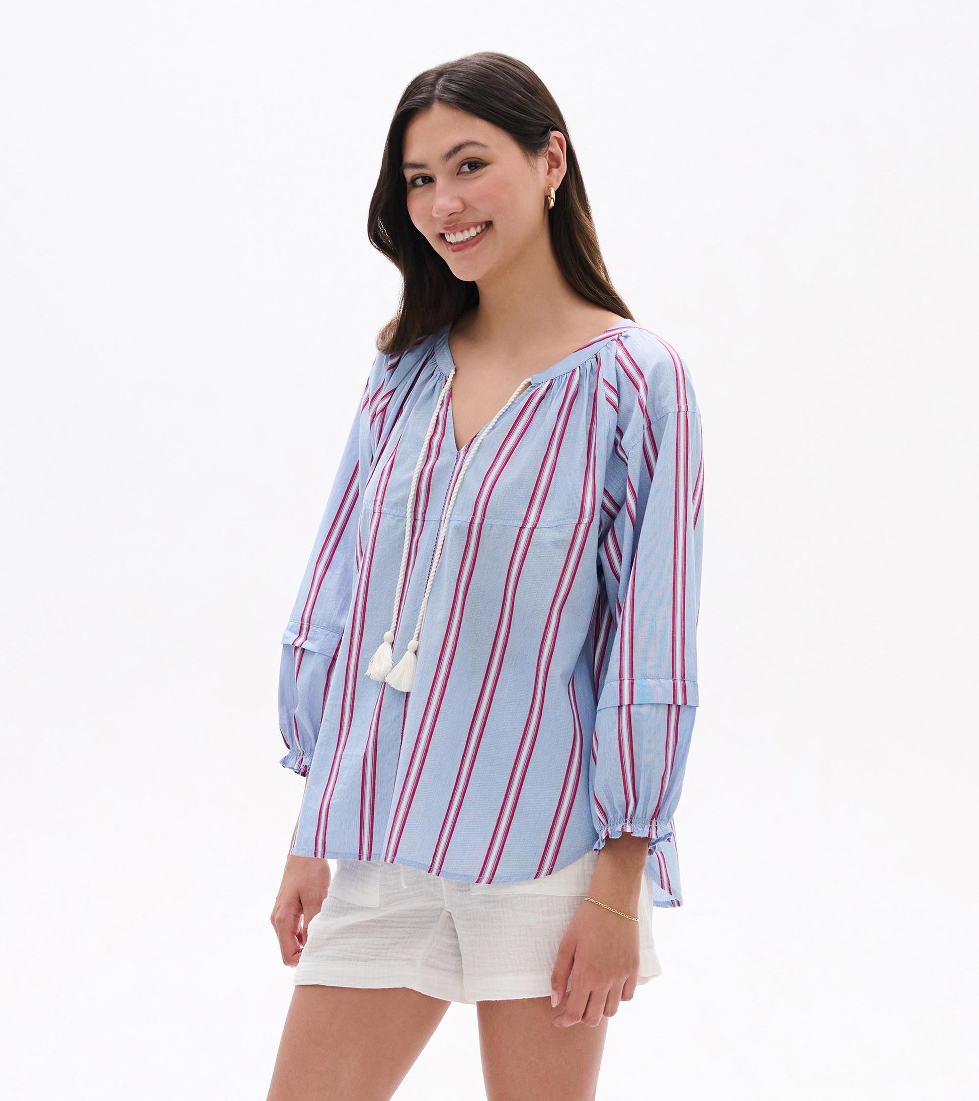 Whimsical rainbow details on chambray bring unexpected joy to this flowing cotton top perfect for spring celebrations. The raglan sleeves allow for comfortable, unrestricted movement whether you're gardening or gallery hopping. Gathered details at the collar create feminine softness, while tassel-trimmed ties add artisanal charm. The curved high-low hemline looks equally polished worn tucked or loose, giving you styling flexibility for any occasion.