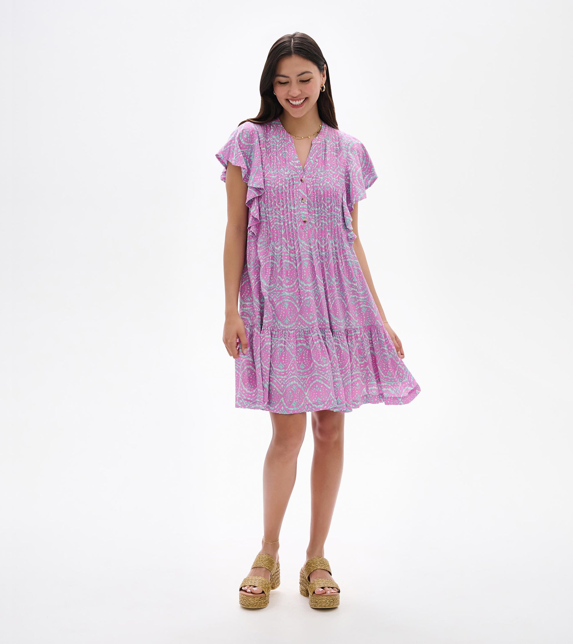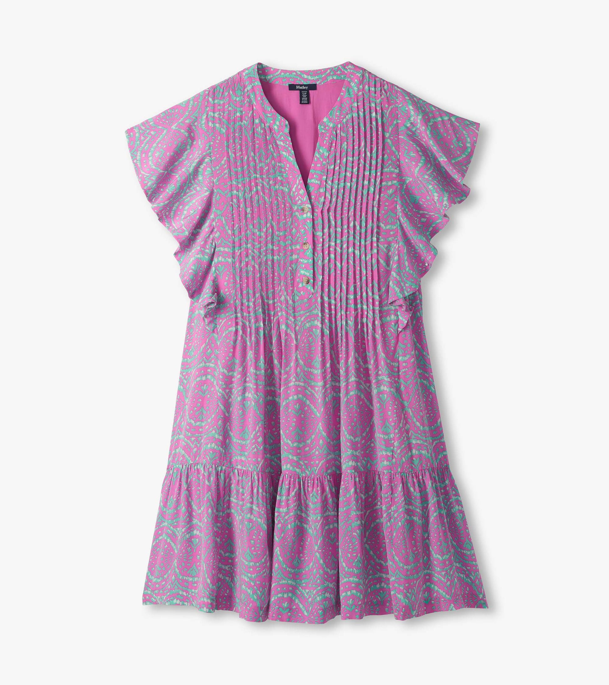 Discover effortless elegance in this beautifully detailed midi dress, perfect for spring and summer celebrations. The flattering pintuck pleats and shoulder ruffles add feminine charm, while the lightweight viscose-rayon blend keeps you cool and comfortable all day long. The tiered skirt, finished with a gently gathered tier at the hem, creates graceful movement, while practical side pockets add functionality to this stylish design. Featuring a V-neckline with a partial button placket, this dress showcases a vibrant pink base with an intricate mint green abstract print for a bold, artistic touch. Whether you're attending a garden party, bridal shower, or outdoor wedding, this versatile dress transitions seamlessly from casual to dressy depending on how you accessorize. The soft ikat print brings an artistic, bohemian vibe that's both timeless and on-trend.