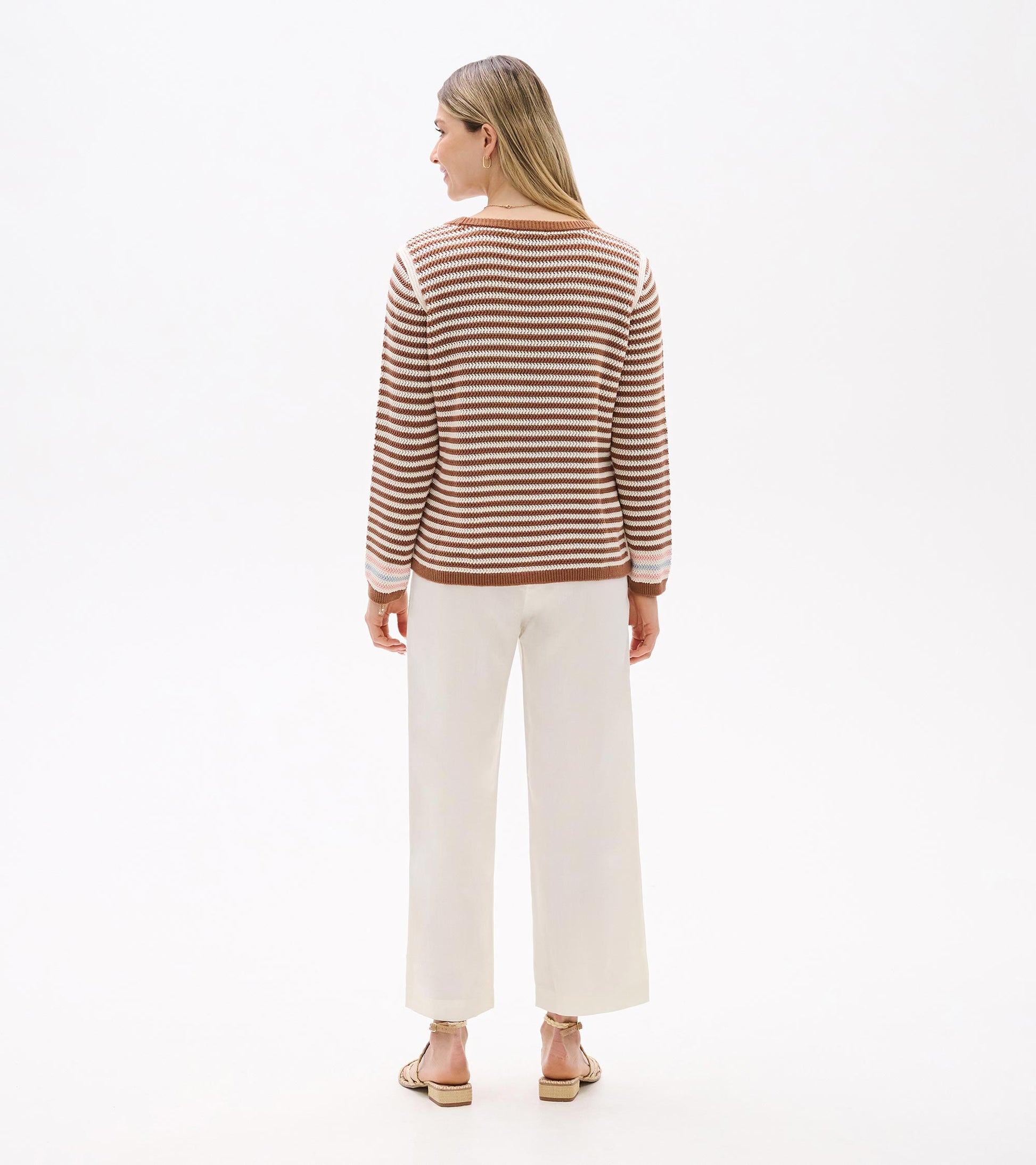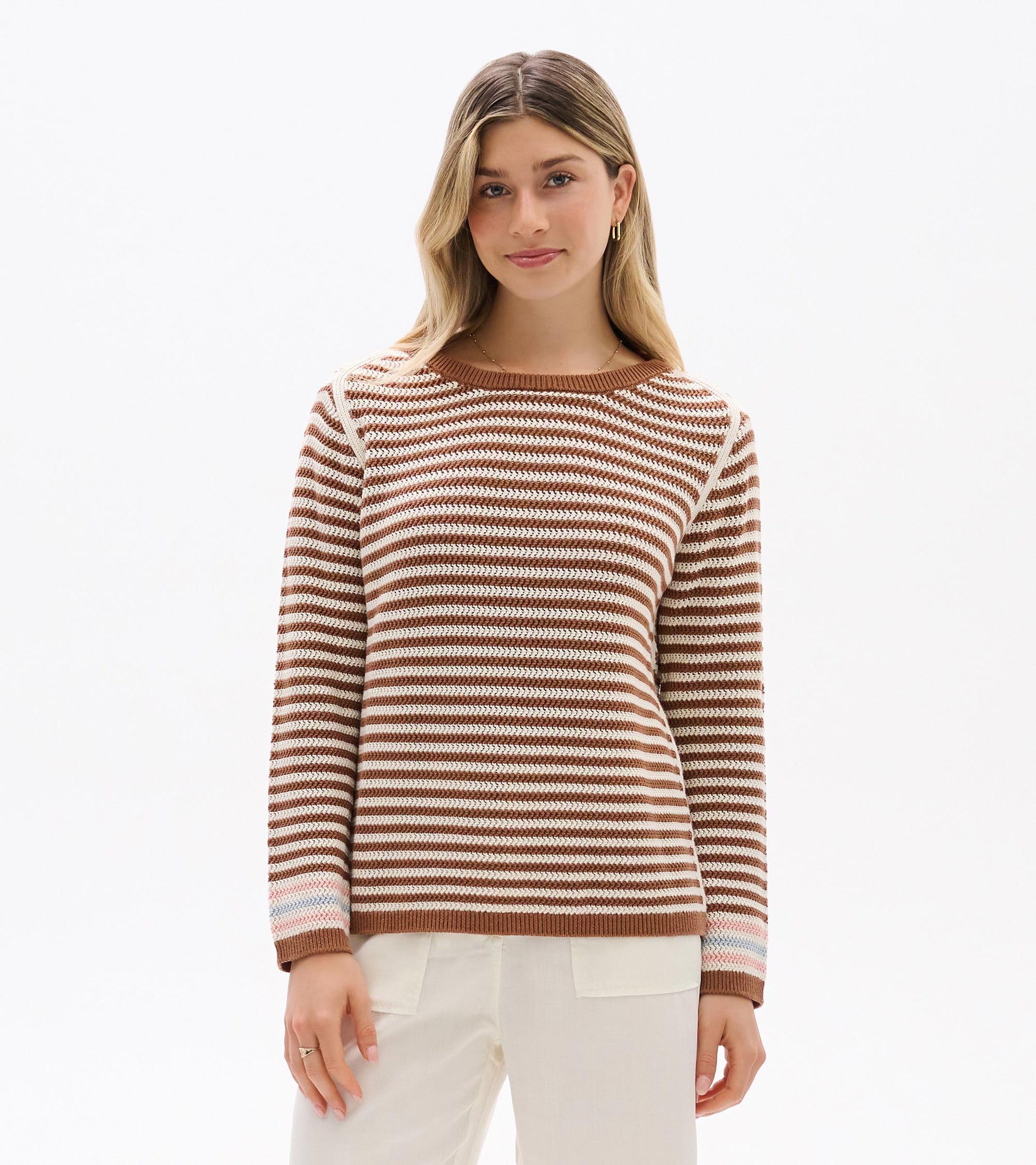 Soft neutral tones and textured pointelle stripes make this cotton sweater an endlessly versatile spring layering essential. The ribbed details throughout create subtle visual interest while offering comfortable stretch. This piece transitions seamlessly from crisp morning walks to air-conditioned offices, providing just the right amount of warmth without bulk. Pair with high-waisted trousers or layer over spring dresses for polished seasonal style.