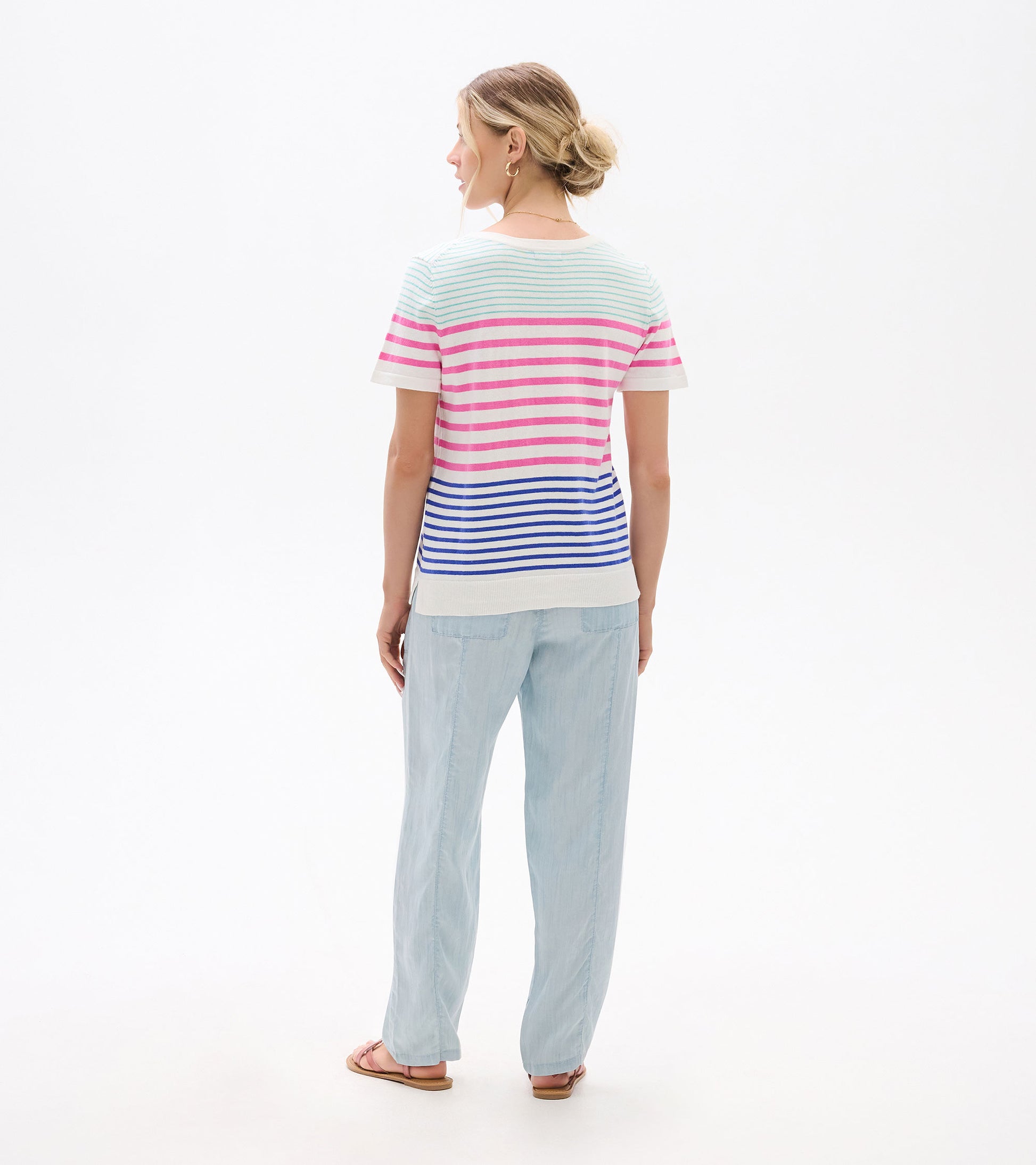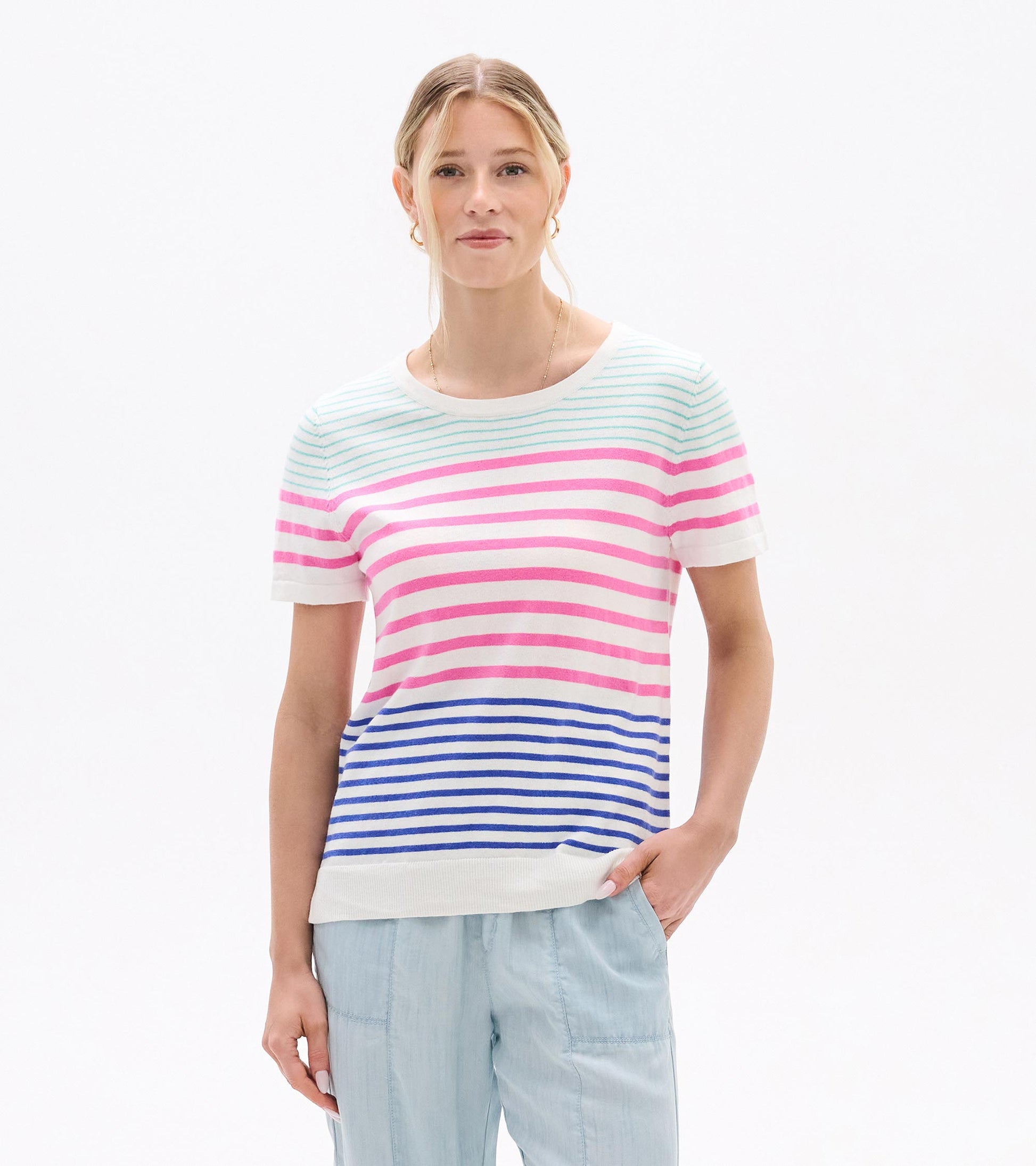 Classic stripes get a fresh update in this perfectly relaxed knit tee that works with everything in your warm-weather wardrobe. The soft cotton jersey feels like your favorite vintage tee from the first wear, and the timeless stripe pattern adds visual interest without overwhelming your look. The versatile design pairs beautifully with white denim, khaki shorts, or casual skirts, while the relaxed fit ensures comfortable all-day wear. Thoughtful details like side slits and a ribbed hem give this everyday essential a polished finish that elevates it beyond basic. Whether you're dressing it down with sneakers or adding sandals for a more refined look, this striped tee delivers effortless summer style.