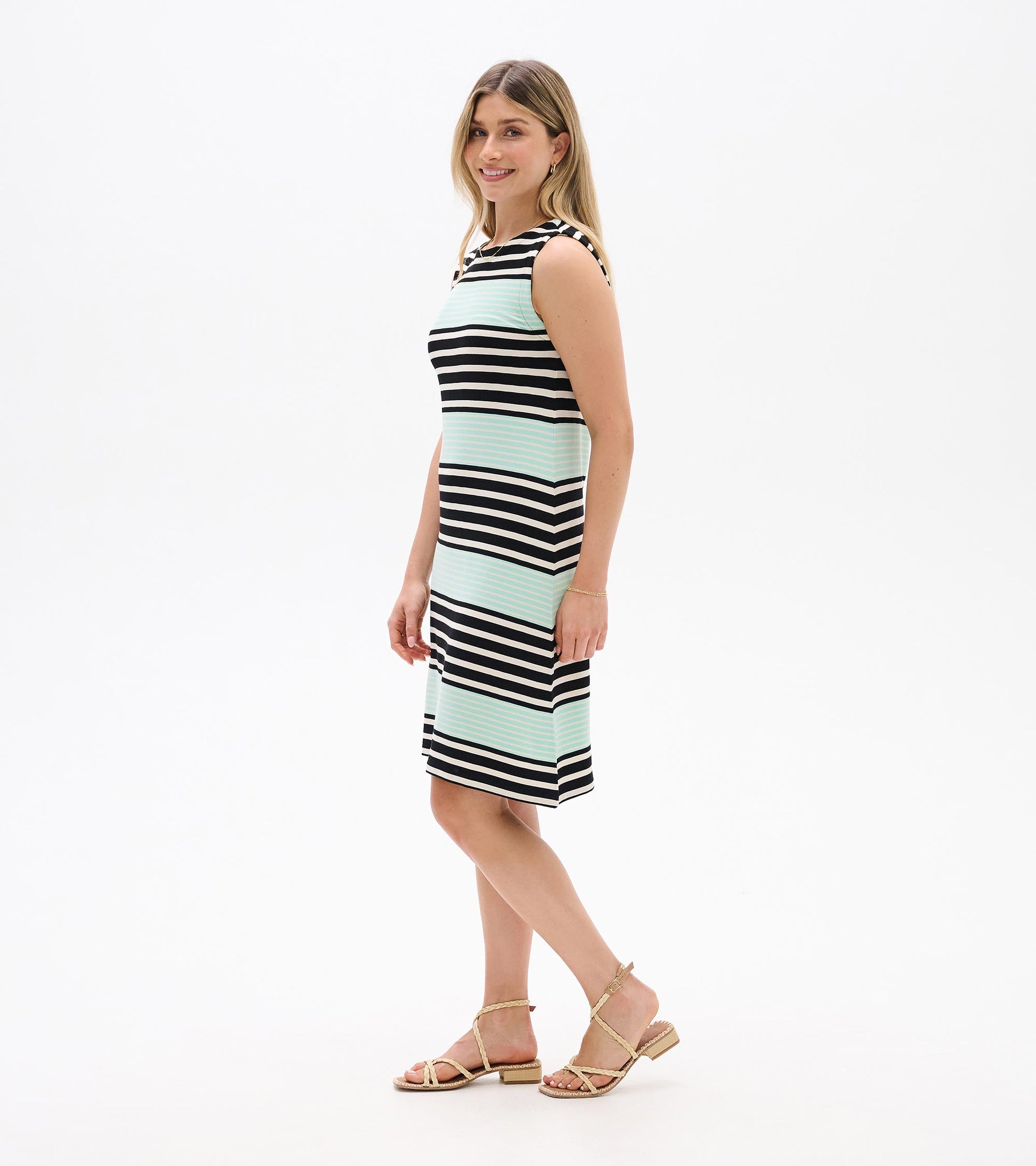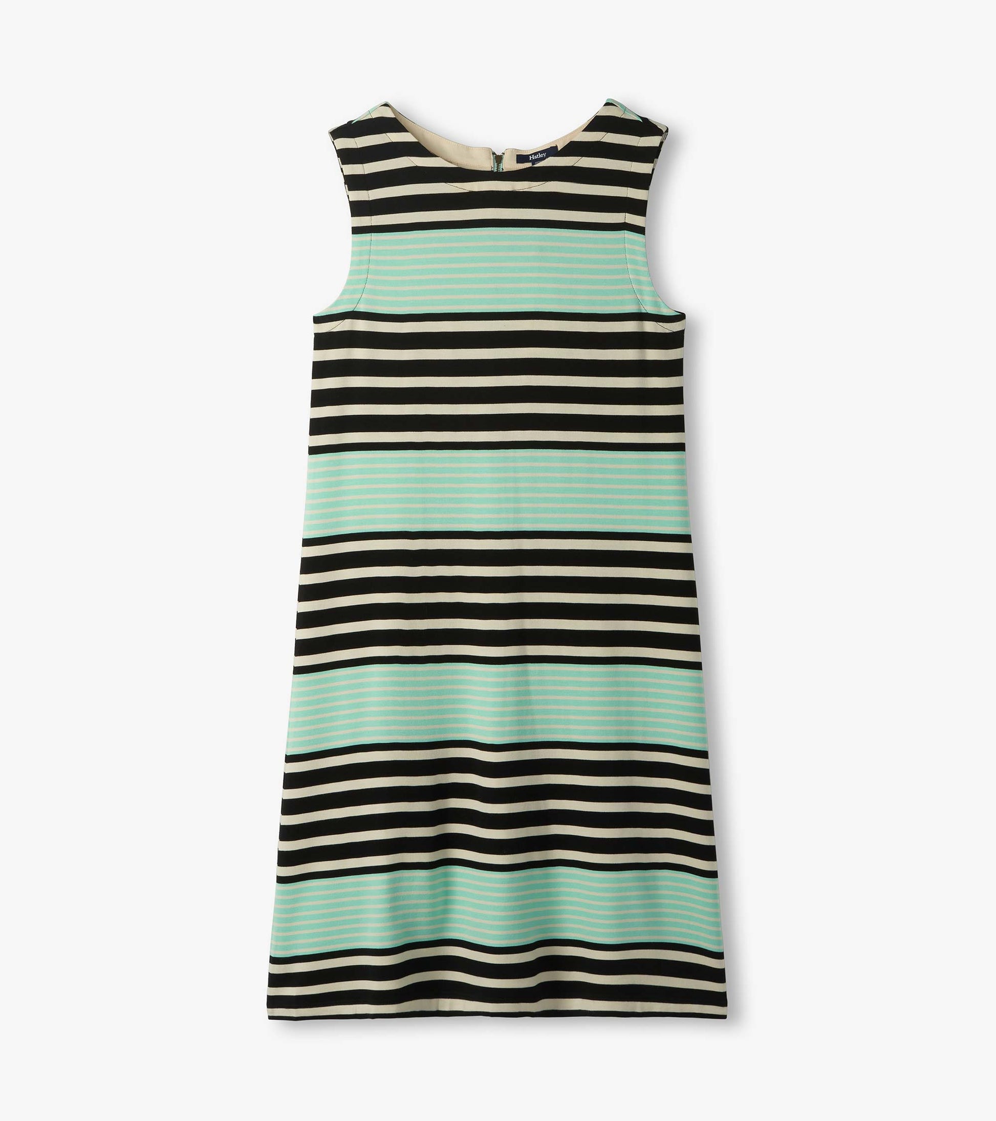 Graphic black colorblock stripes give this sleeveless knit dress modern edge while the A-line silhouette keeps it universally flattering. The viscose and spandex blend skims your body comfortably without clinging, offering easy movement for active spring days. Contrast fabric trim at the neckline adds refined detail, and the decorative exposed back zipper with tassel pull brings unexpected charm. Simply add sandals and a tote for effortless warm weather style.