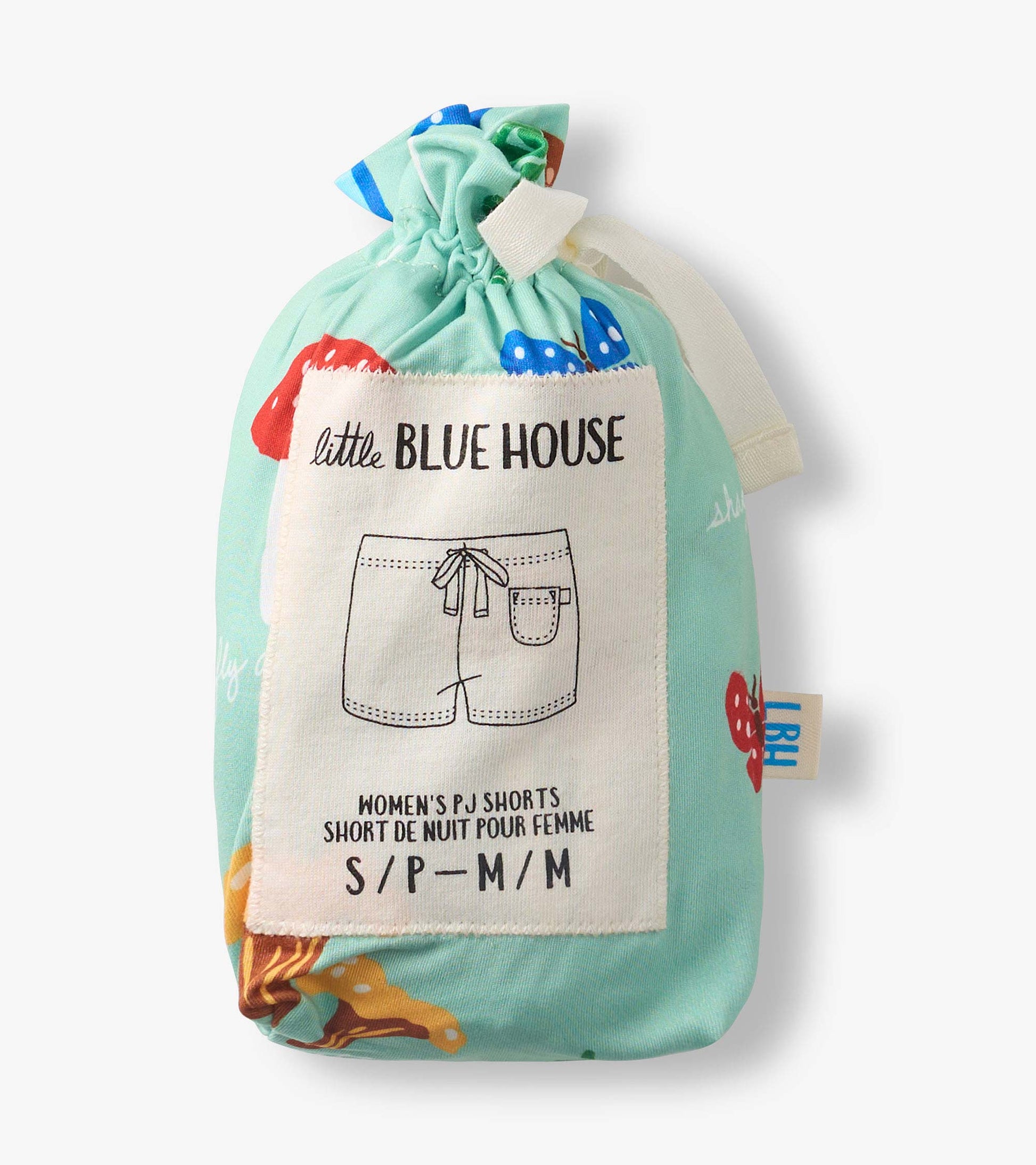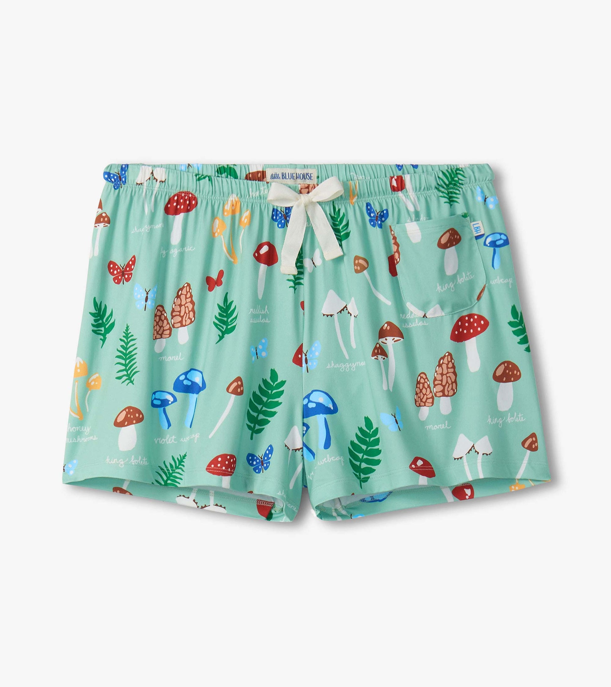Crafted from soft Dreamspun poly knit fabric, these whimsical pajama shorts are lightweight, breathable, and designed for all-night comfort with a relaxed, easy fit. The mint-green base is covered in an all-over illustrated woodland print featuring butterflies and forest details. A variety of mushroom types appear in playful shades of red, blue, brown, and cream, each accented with small handwritten-style labels for a storybook botanical touch. An elastic waistband with an adjustable cream-colored drawstring provides a customizable fit, while a side pocket detail adds practical convenience. Each pair comes packaged in a matching drawstring pouch made from the same printed fabric, making them ready for effortless gifting. Perfect for birthdays, thank-you gifts, or a spore-taneous self-treat, these pajama shorts blend cottagecore charm with everyday comfort.